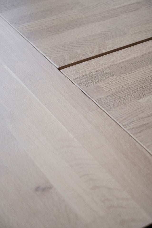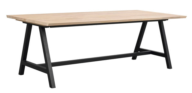 Carradale dining table 220 cm in whitewashed oiled FSC certified oak. Two-part solid table top with brushed surface and powder coated black metal A-shaped legs. The table can be supplemented with 1 or 2 additional extensions. The dining table is part of the flexible Carradale series where you can design the table the way you want it by choosing between different shapes and colors on the table top and which type of table legs you want.