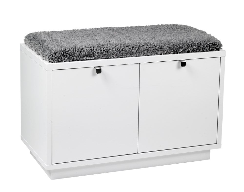 Confetti bench in solid and white lacquered birch with cushion in sheepskin imitation. Practical and stylish seating bench with two spacious drawers that take care of the storage. Included in our hall series Confetti.