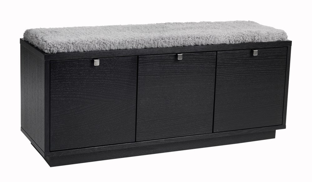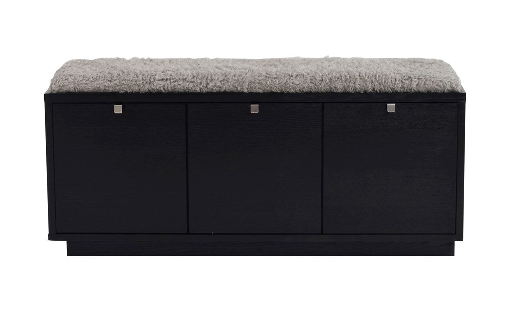 Confetti bench in solid black lacquered oak with cushion in sheepskin imitation. Practical and stylish seating bench with three spacious drawers that take care of storage. Included in our hall series Confetti.