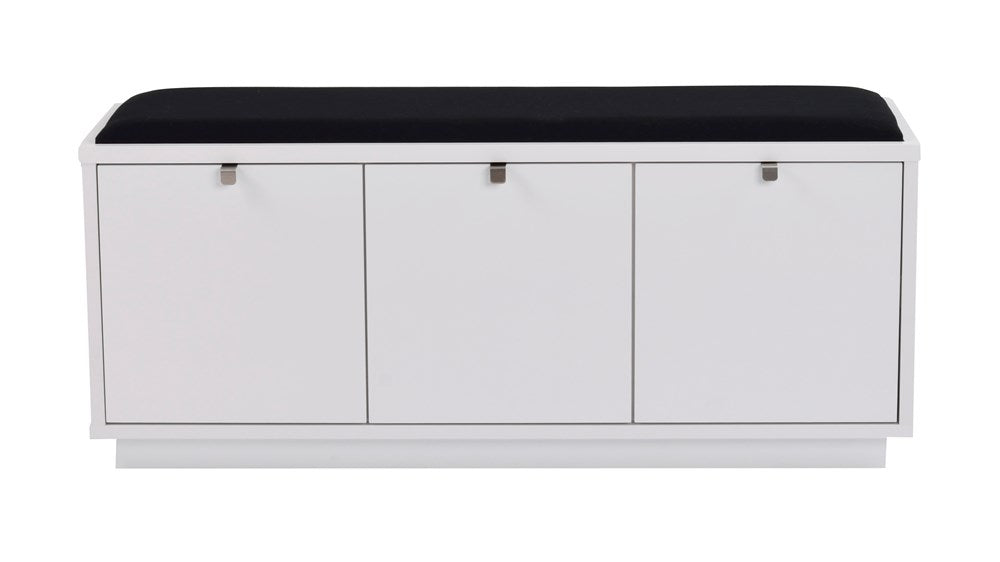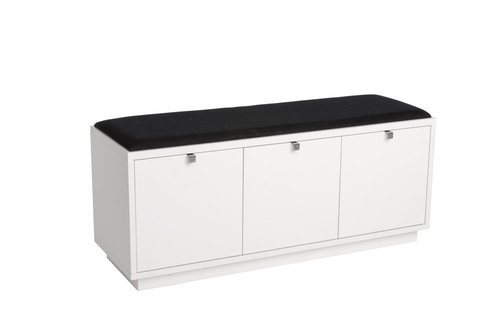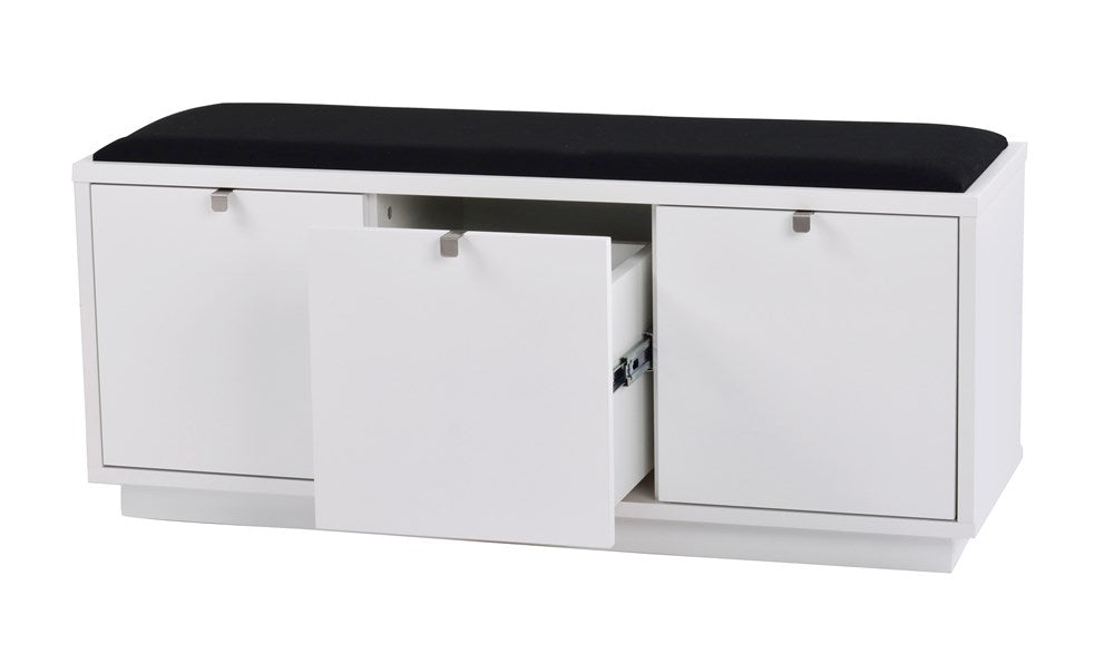Confetti bench in solid white varnished birch. Practical and stylish seating bench with three spacious drawers that take care of storage. The bench is part of our hall series Confetti.