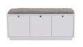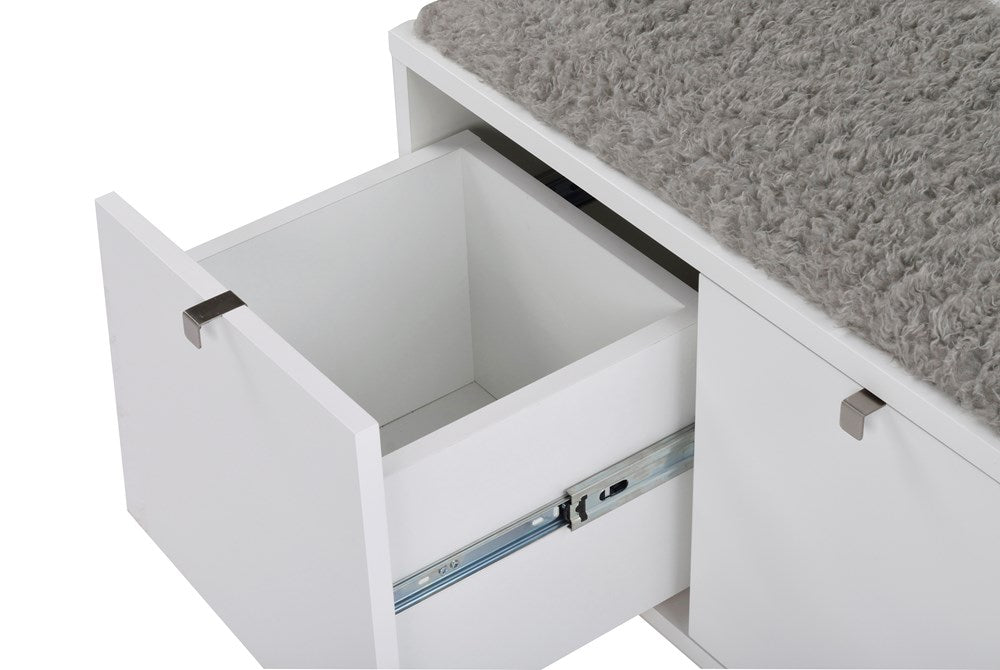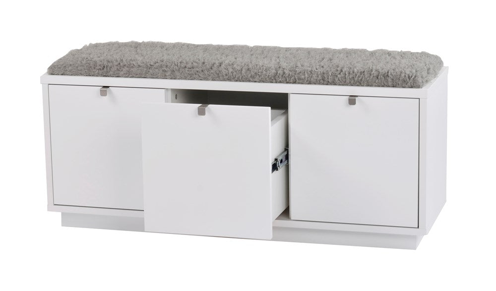 Confetti bench in solid white lacquered birch with cushion in sheepskin imitation. Practical and stylish seating bench with three spacious drawers that take care of storage. Included in our hall series Confetti.