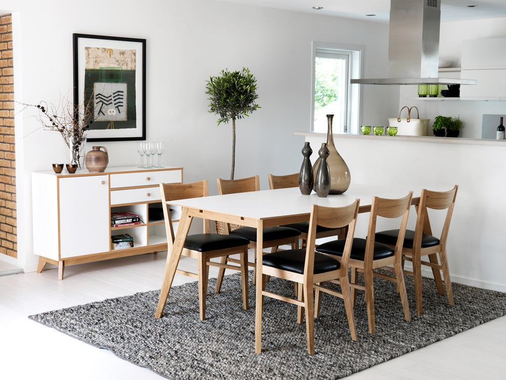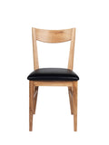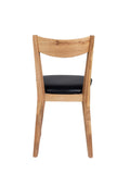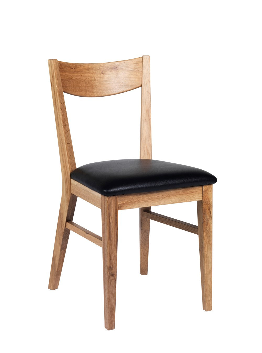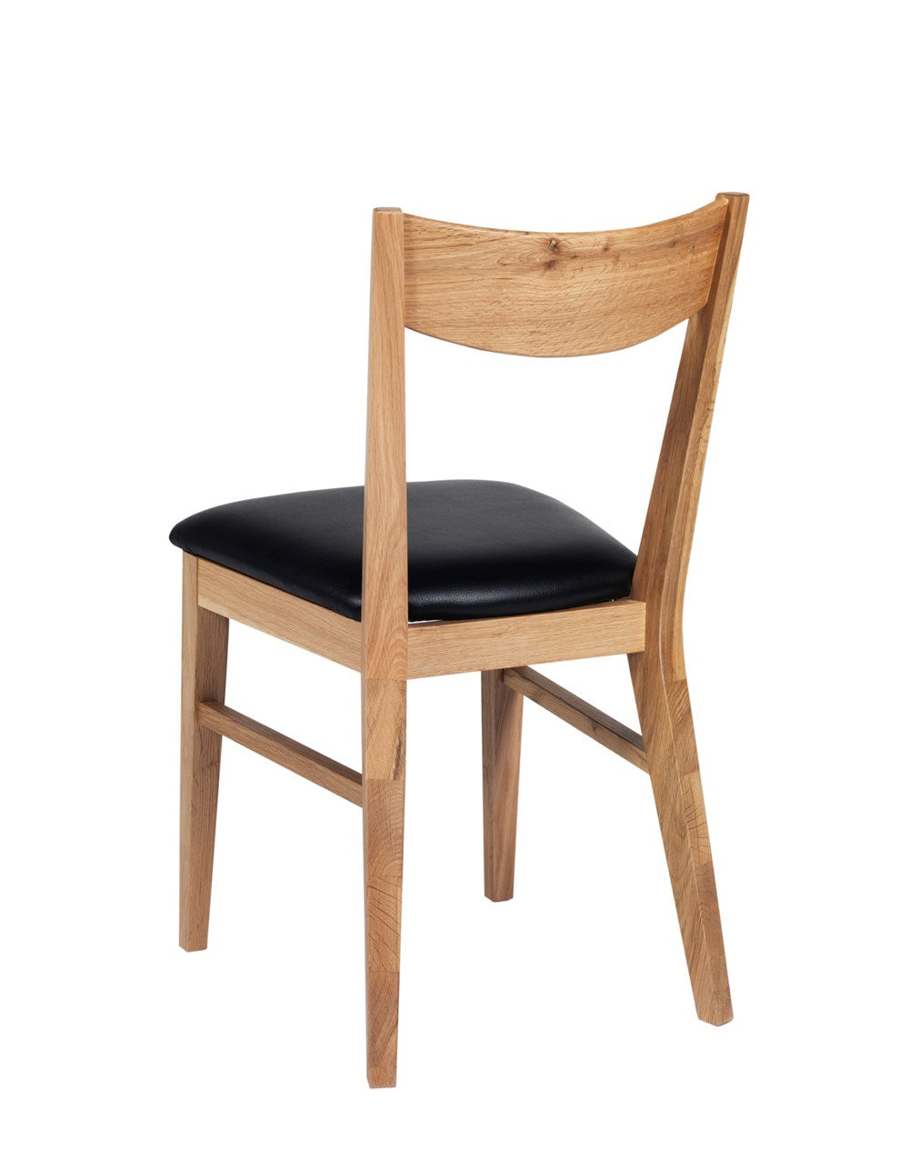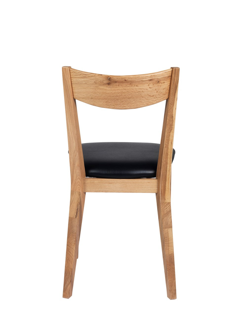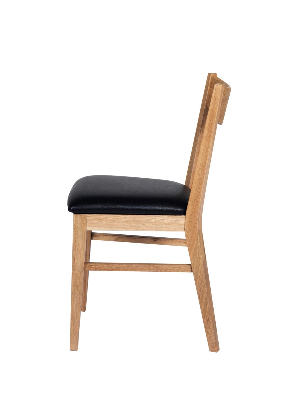 Wooden chair in timeless design with upholstered, upholstered seat in black artificial leather. Wooden frame in matt lacquered solid oak. The chair is part of our series Dylan.