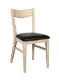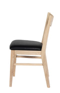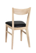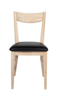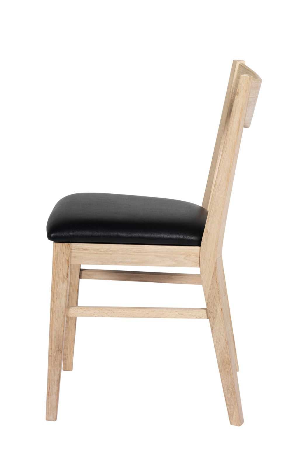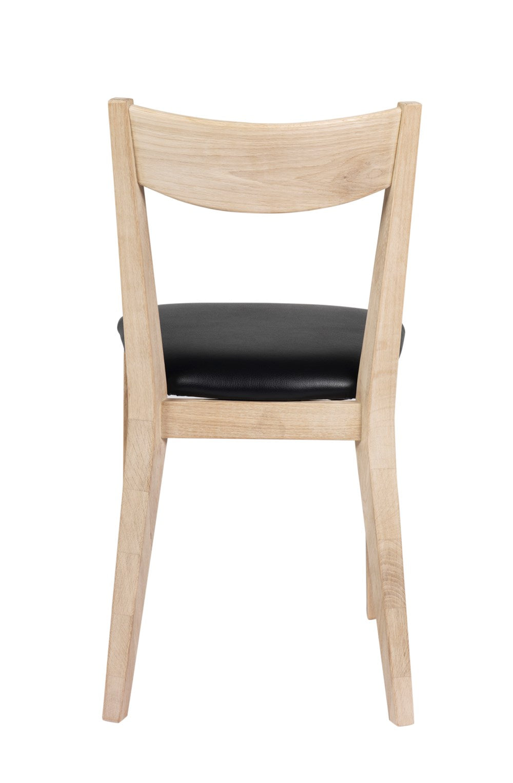 Wooden chair in timeless design with upholstered and upholstered seat in black artificial leather. Wooden frame in lacquered and white pigmented oak. The chair is part of our series Dylan.
