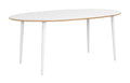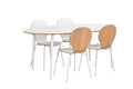 A stylish and modern dining table with a high pressure laminated board and legs in white painted book. The table top is very scratch resistant. The dining table is part of the Fusion series.