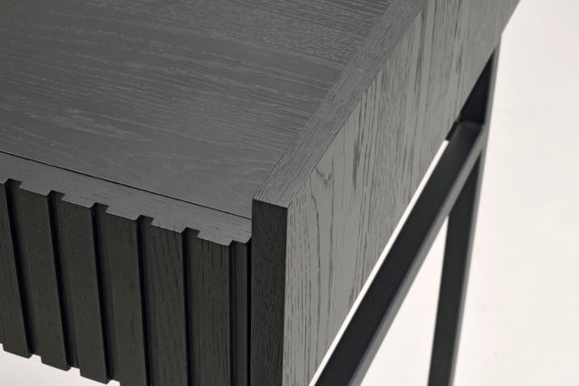 Material: Oak veneer on MDF. Solid oak strips on front. Legs in powder coated metal in sand structure. Knobs in gold finished brushed metal.