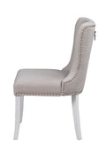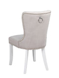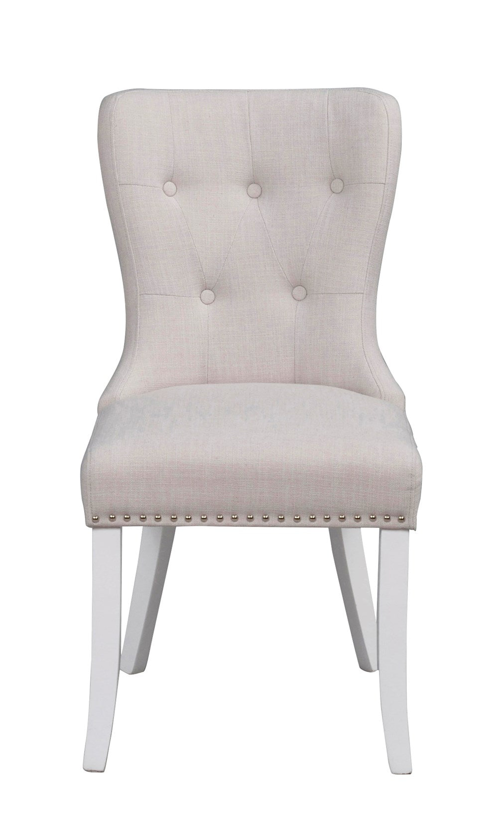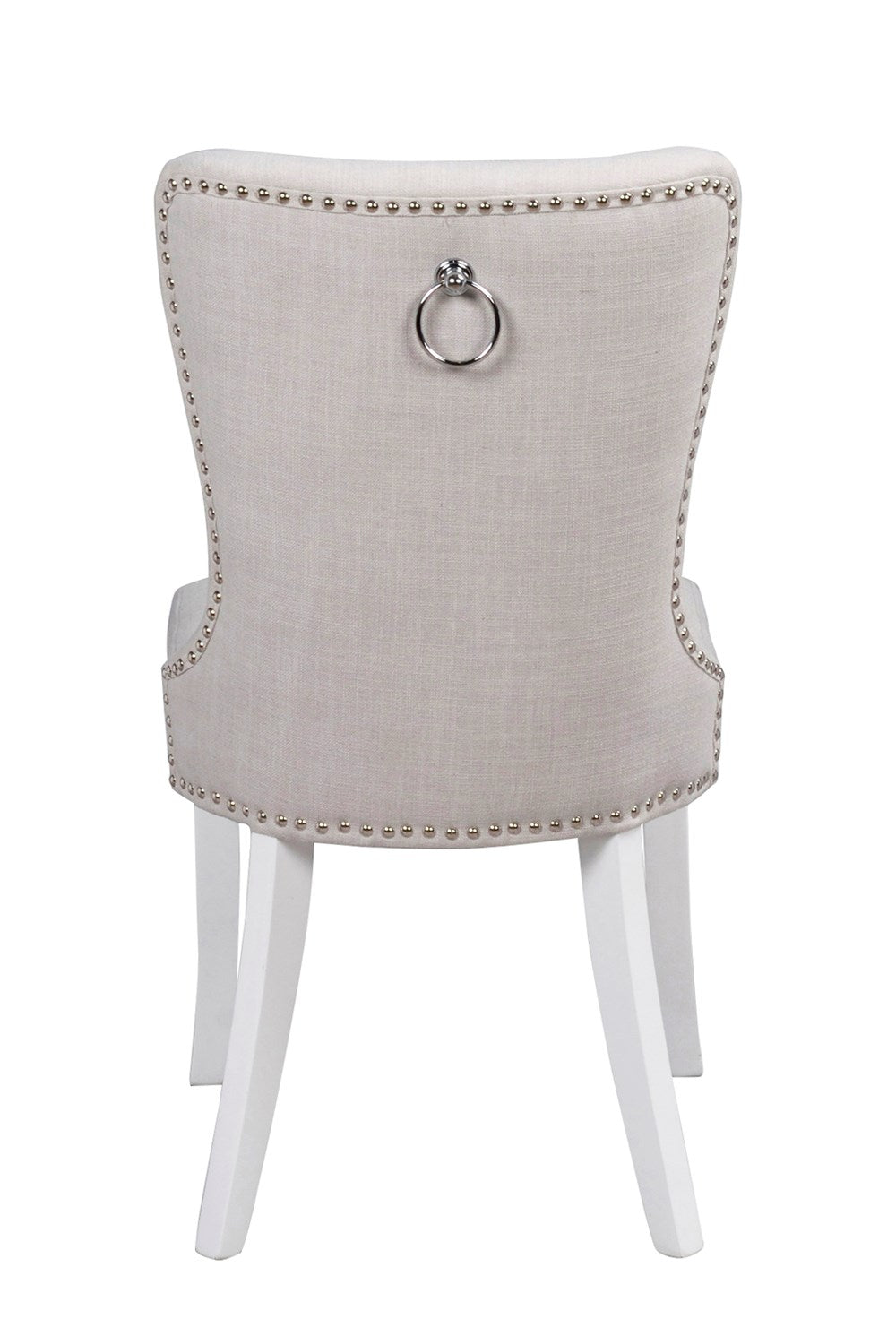 Ina chair is elegant and timeless with soft shapes. Legs in white painted wood. A upholstered seat with a beige fabric and rivets in shiny metal. On the back a decorative ring that gives the little extra. The chair is part of Rowico's chair series Ina.