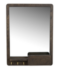 Inverness mirror with a frame in solid brown lacquered oak has a functional shelf for the mobile phone or the keys. Decorative brass-coloured hooks give the mirror a luxurious look. Feel free to combine with other products in the hall series Inverness.