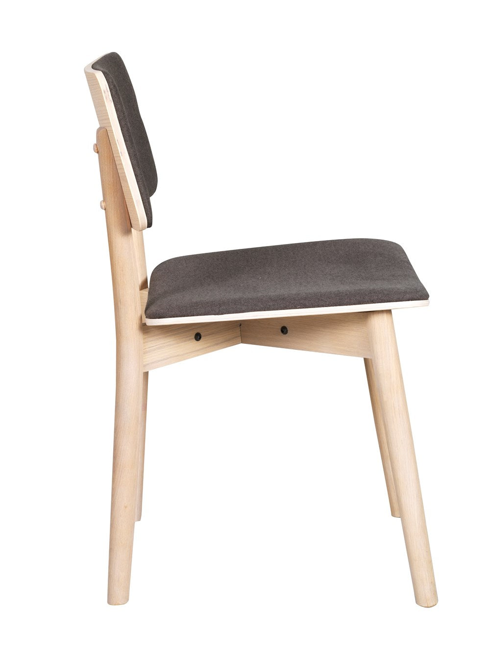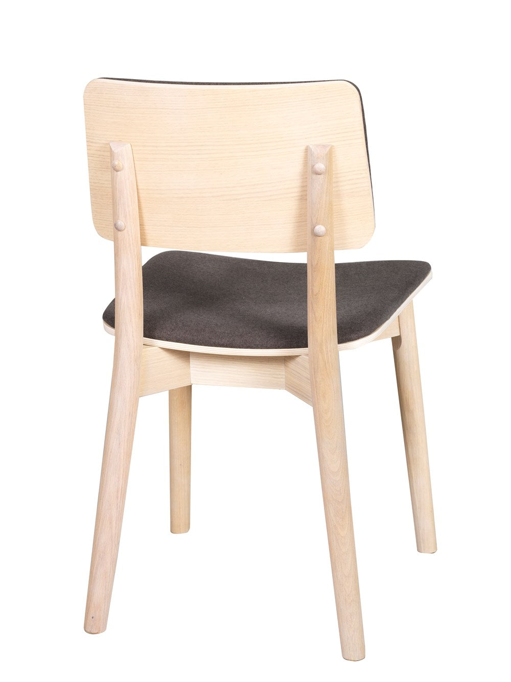 Wooden chair in Scandinavian design with upholstered seat. The chair is white pigmented and has a dark gray durable fabric. Included in our chair series Kazo.