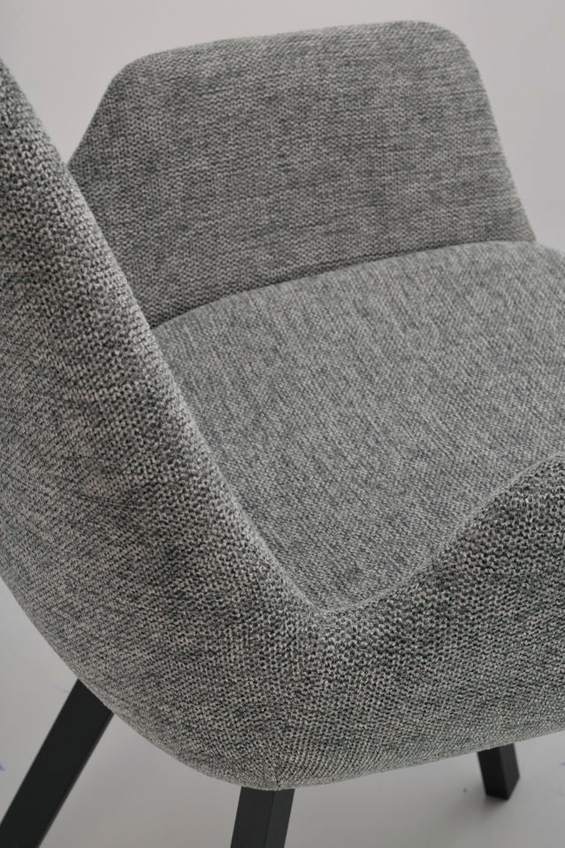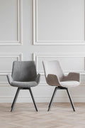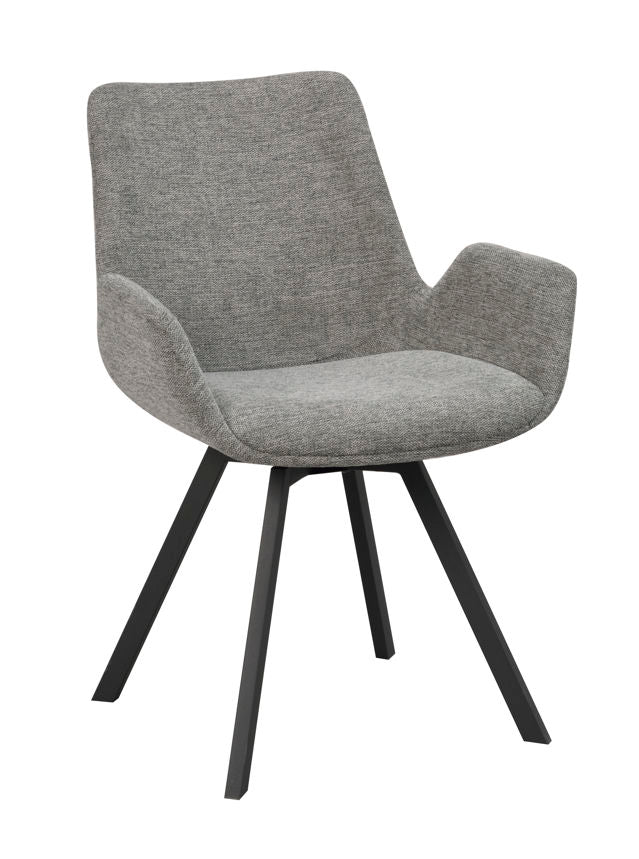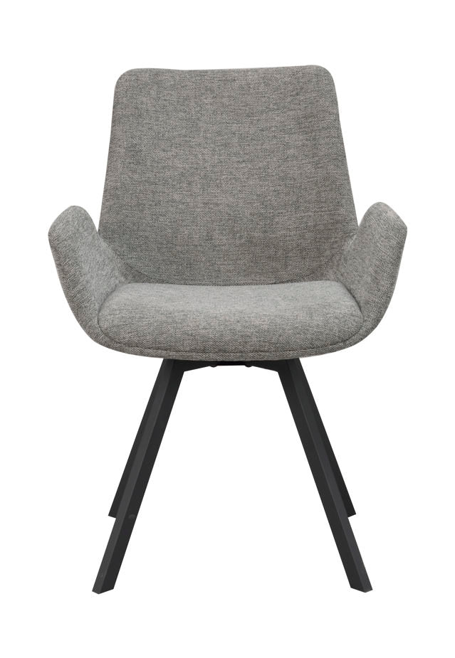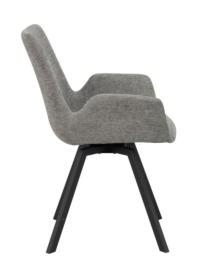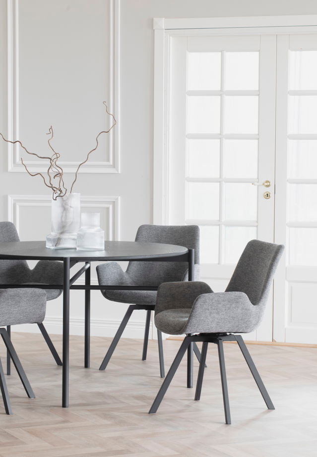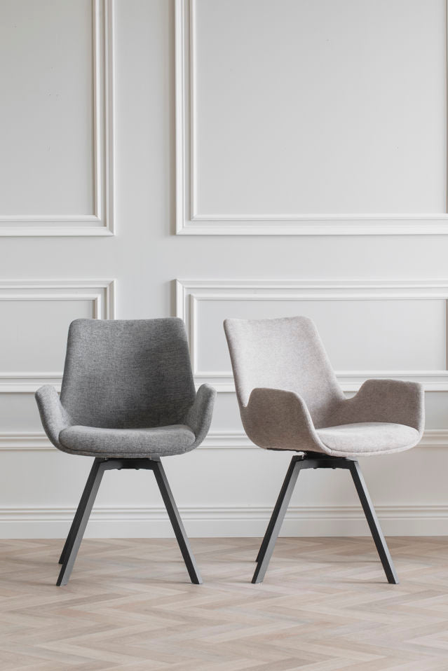 Norwell armchair in grey fabric with swivel function is a modern and comfortable chair. The legs have a flexible rotating function in 360 degrees and consist of black metal. Also available with beige seat. Sold only in 2-pack.