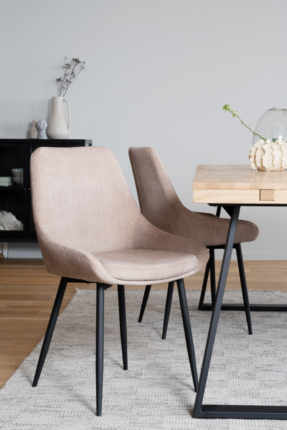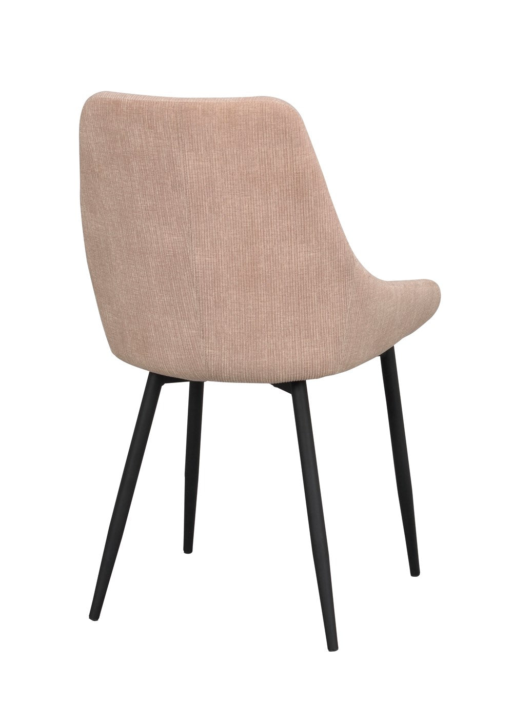Sierra chair in modern design with cushioned seat and back. Seat in beige trendy Manchester fabric. Stylish legs in black powder coated metal. The chair is part of our series Sierra and is available in several colors and materials.
