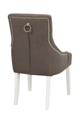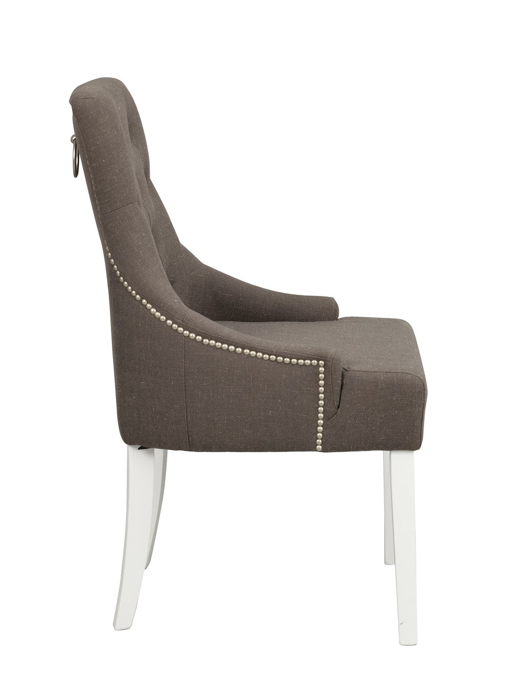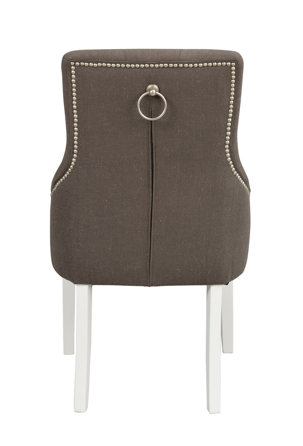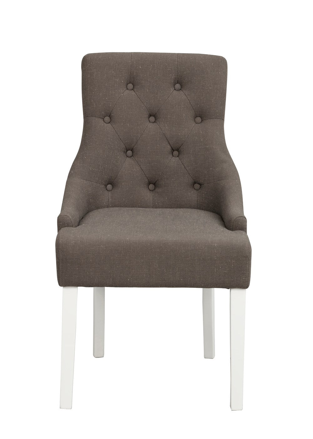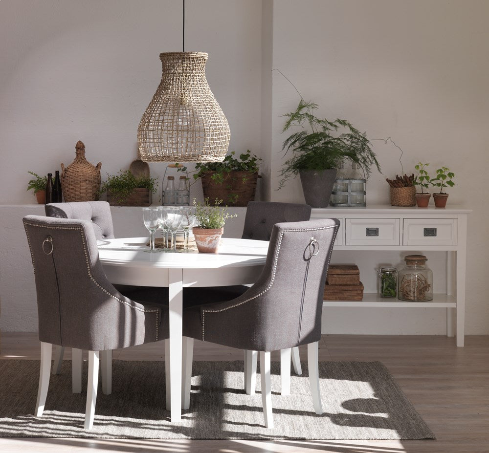 Stella chair is of high quality with wide and beautifully dressed seat. Legs in solid white lacquered wood and seat in gray fabric. Brushed rivets with a decorative ring at the back give an elegant impression. Fits as well for the dining table as for itself. The chair is part of our series Stella.