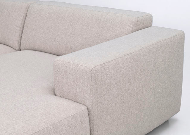 Willard 3 seater sofa with chaise longue to the right is a minimalist and modern lounge sofa - here in the beautiful bouclé fabric Alice in a light beige colour. The appealing sofa will create a very modern Scandinavian design feeling in your home. The lovely chaise longue gives you extra seating, perfect for you who have limited space in the living room. Willard is a buildable modular sofa that allows you to customize it according to your wishes. It is available in two standard fabrics, Brenda Beige and Alice Light Beige, but you also have the possibility to choose one of our many other fabrics in different colours. Each module is not completely covered, which means that they must be used as a part of Willard sofa and not separately. The collection is made in Europe and all the wood in the furniture is FSC-certified.