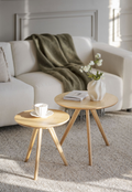 Yumi nest of tables with slightly exposed legs in a timeless Scandinavian design that lasts year after year. Table tops in lacquered oak veneer and legs in solid oak. Large table; Ø 50 cm, height 45 cm, small table; Ø 40 cm, height 40 cm.