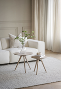 Yumi nest of tables with slightly exposed legs in a timeless Scandinavian design that lasts year after year. Table tops in whitewashed lacquered oak veneer and legs in solid oak. Large table; Ø 50 cm, height 45 cm, small table; Ø 40 cm, height 40 cm.