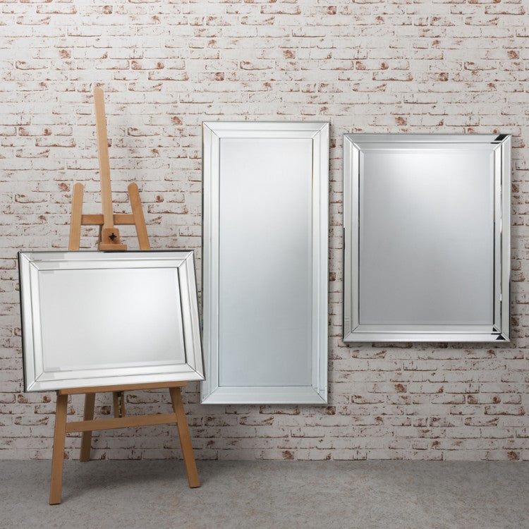Contemporary mirror framed mirror with a double bevelled strip. -