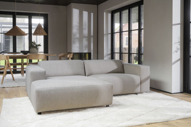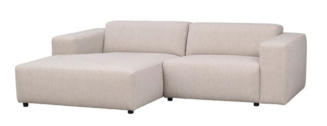 Willard 3 seater sofa with chaise longue to the left is a minimalist and modern lounge sofa - here in the beautiful bouclé fabric Alice in a light beige colour. The appealing sofa will create a very modern Scandinavian design feeling in your home. The lovely chaise longue gives you extra seating, perfect for you who have limited space in the living room. Willard is a buildable modular sofa that allows you to customize it according to your wishes. It is available in two standard fabrics, Brenda Beige and Alice Light Beige, but you also have the possibility to choose one of our many other fabrics in different colours. Each module is not completely covered, which means that they must be used as a part of Willard sofa and not separately. The collection is made in Europe and all the wood in the furniture is FSC-certified.