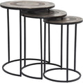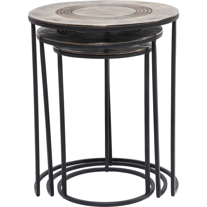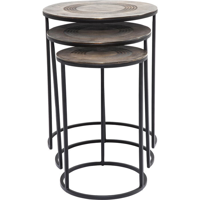 - Real craftsmanship: a set of 3 round metal side tables with graphically decorated tops