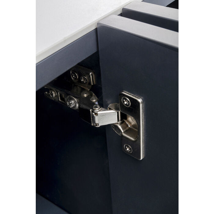 - A modern sideboard in dark grey with silver-coloured highlights and marble look