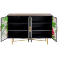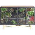 This sideboard easily manages to look both natural and glamorous at the same time. The sturdy body made of ash and the hand-painted decorations on the glass doors radiate jungle vibes, while the black metal frame and the golden handles and feet provide just the right amount of elegance. Not everyone has such a beautiful sideboard in their living room - so it s only appropriate to decorate this treasure with plants and ornamental objects as eye-catchers.