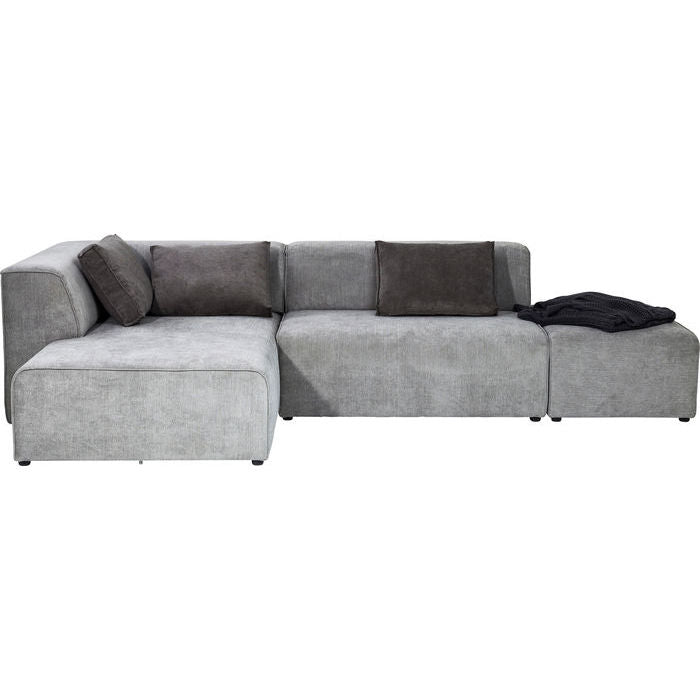 Laid-back and inviting, that s how the corner sofa with ottoman Infinity presents itself. This sofa is a smart crossover of reduced chic, the lounge style and casual elegance. The ottoman also makes this couch extremely versatile, enabling it to be used as an extension of the seating area or placed freely in the room as an additional seat or coffee table. Infinity is ideal for the loft, but fits just as well into a classical environment.In addition to the ottoman, the scope of delivery includes three back cushions as shown. Well-balanced proportions, comfortable upholstery, carefully crafted details such as the striking outer seams and an ottoman turn this traditional corner sofa into a comfortable and tasteful place to relax. Throw cushions included.