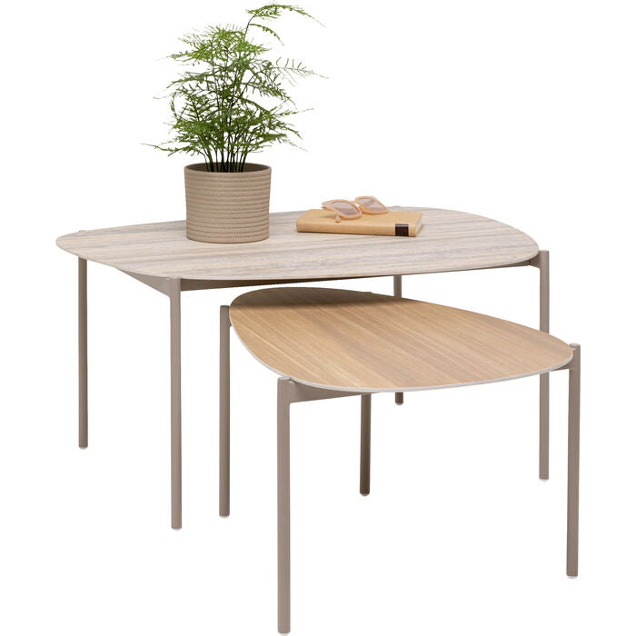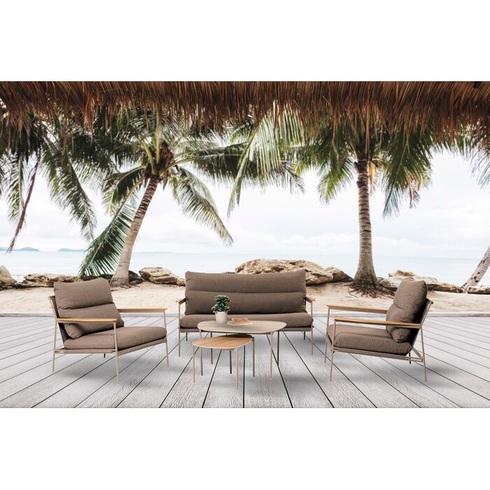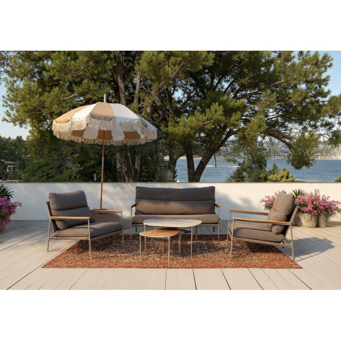 A stylish and versatile outdoor sofa set designed for comfort and durability. Featuring a powder-coated steel frame with soft polyester cushions and a polypropylene backrest, this set offers reliable support and a clean, modern look. The matching table with lacquered stoneware top adds a refined touch, making it ideal for gardens, patios, or terraces.