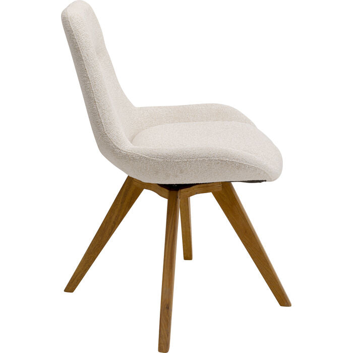 This swivel chair combines delicate cream bouclé with robust oak wood to create a modern classic. The soft, ergonomic seat shell promises maximum comfort, while the practical swivel function ensures flexibility in both the home office and dining room. With its elegant blend of natural materials and timeless shape, this chair is not only a functional piece of furniture, but also a real eye-catcher. It fits perfectly into Scandinavian, modern or minimalist interior styles and combines beautifully with wooden or metal accents to create a harmonious and stylish atmosphere.