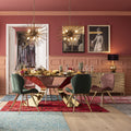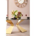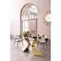 Luxury appeal and sophistication. A little glamour never hurt anyone. This dining table could also be a modern piece of furniture sculpture in a museum. It makes an impact with its creative refinement and elegant, slightly eccentric touch. The 13 mm thick safety-glass table top is supported by two artistically shaped, gold-coloured legs. The table is perfectly suited for a glamorous and eclectic interior, and provides a touch of Hollywood appeal. This enhances the star quality of your furnishing.