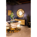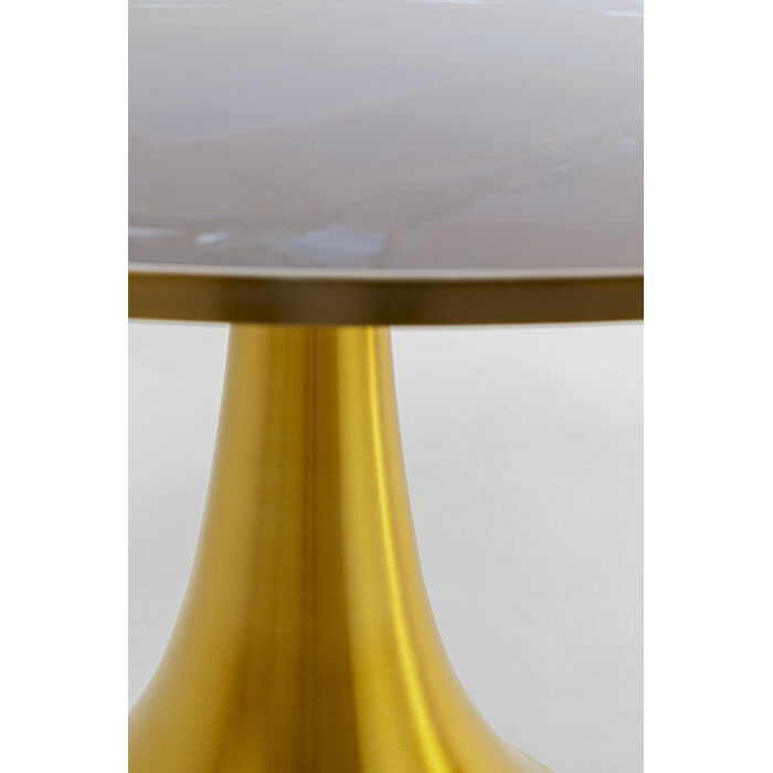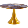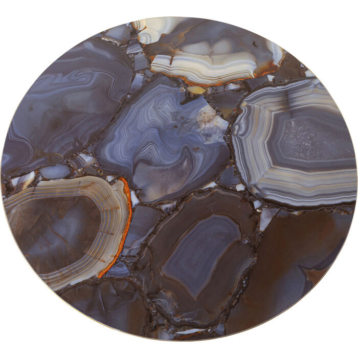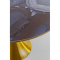 A real statement piece with the wow factor: this round dining table combines extravagant glamor with a harmonious look. The artistically designed table top in an agate look looks like a cut gemstone - with fine lines, luxurious color gradients and a touch of mysticism. The sculptural central base made of gold-colored aluminum brings a touch of art deco into play and at the same time ensures stability with lightness. Ideal as a central highlight in modern dining areas, combined with velvet chairs, smoky glass or accents in cream and brass. Perfect for stylish dinners, inspiring conversations and all those moments that call for a special setting.