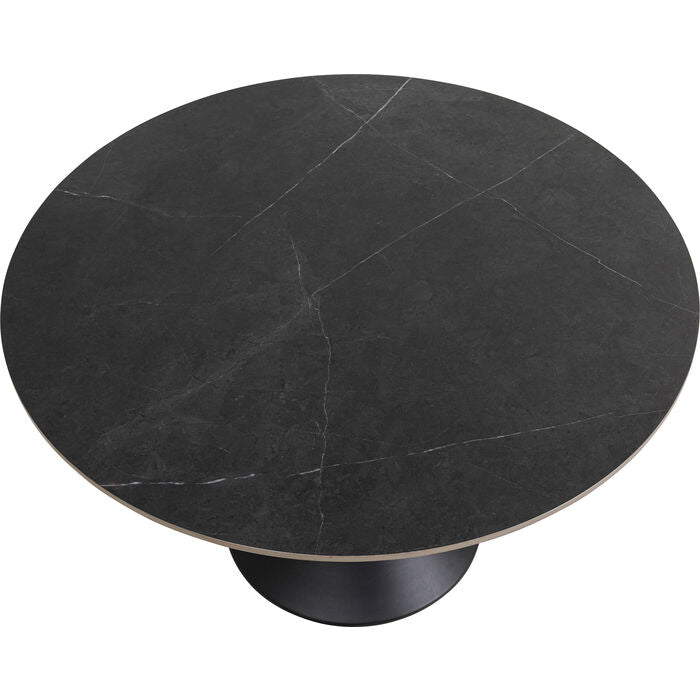 A round dining table with futuristic vibes: with this sculptural, all-black table, you will definitely get a modern statement piece of furniture in your home! The great advantage is that this table can be used as a garden table on the terrace and balcony, as well as a table in the dining room. The high-quality table top made of dark ceramic is reminiscent of natural stone thanks to its grain and look. The extravagant base made of powder-coated metal in the shape of a tulip completes the look. With the colour black, you also add an exciting contrast to your living style.