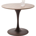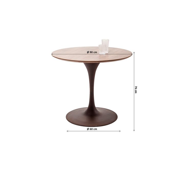 - A round modern table in the classic design tradition with a lacquered metal base and a fine top with real wood veneer in walnut.