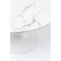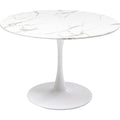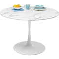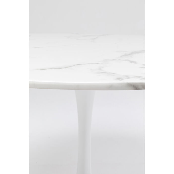 Take a seat with your loved ones at the round table - four people can sit comfortably at this charming white model with its tulip base and also face each other. This is the clear advantage of the shape, which is further enhanced by the chic and space-saving tulip base made of sturdy steel. Thanks to the high-gloss white lacquer, this piece of furniture also looks very light and can be playfully combined with different furnishing styles. The round table top made of mineral marble looks particularly glamorous in combination with gold decoration, for example a flower vase.