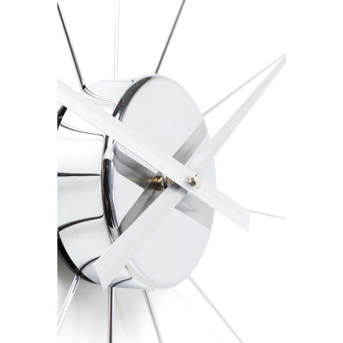 An original clock with the umbrella look - In design this clock is a match for your umbrella. The metal spokes radiate outwards towards the edge of the clock, marking its numerals with pretty little metal balls. Instead of the little balls the four points of the compass can be applied as decorative numbers in black. With its filigree metal look the Like Umbrella Chrome clock is a very special piece. An ingenious timepiece which will harmonise with any furnishing style thanks to its simplicity of design.