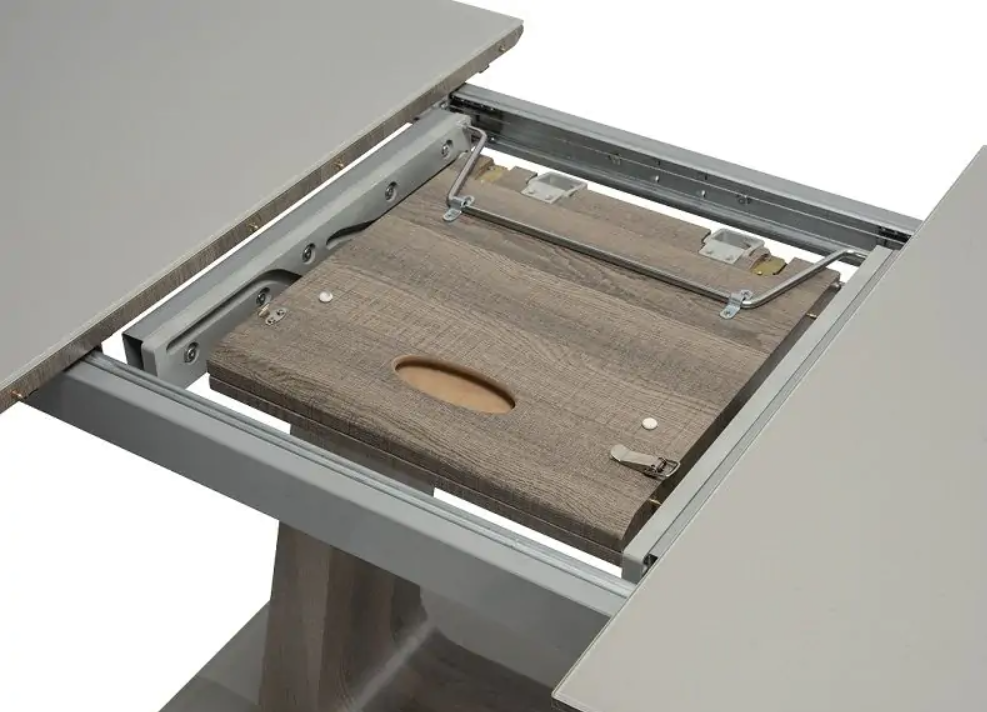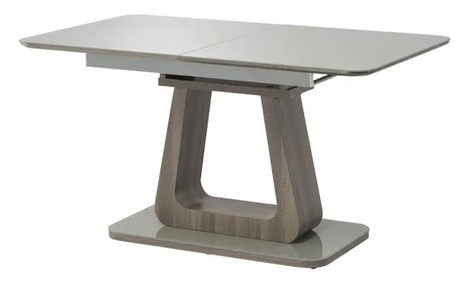 A stunning glass topped extending dining table with grey top and grey or grey oak extension insert, U-shaped pedestal style bases in grey or oak finished with a smooth glass base. This dining table uses the latest pull handle mechanism for effortless open & close.