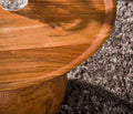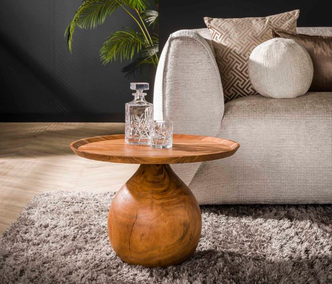 This coffee table is made of solid acacia wood. The table top has a raised edge. The base of the table has a round shape. This table combines very well with the matching side table.