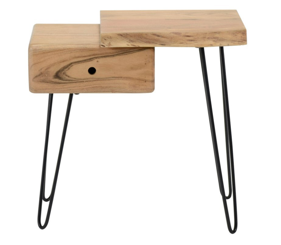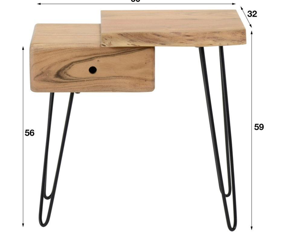 This bedside table is made of solid acacia wood. The cabinet has a beautiful tree-trunk shape, which gives it a natural look. This model is equipped with a drawer unit, which is located at the front on the left, and a plateau. This bedside table or side table live edge is equipped with a thin leg from powder coated black metal.