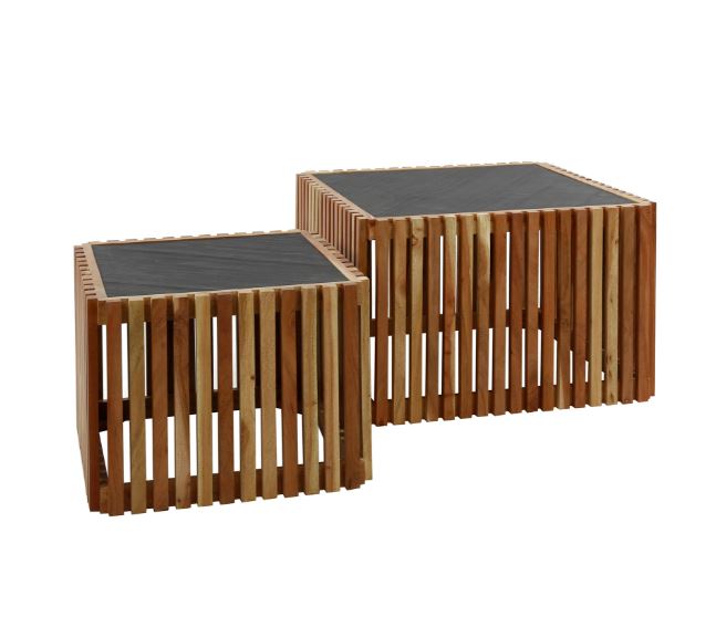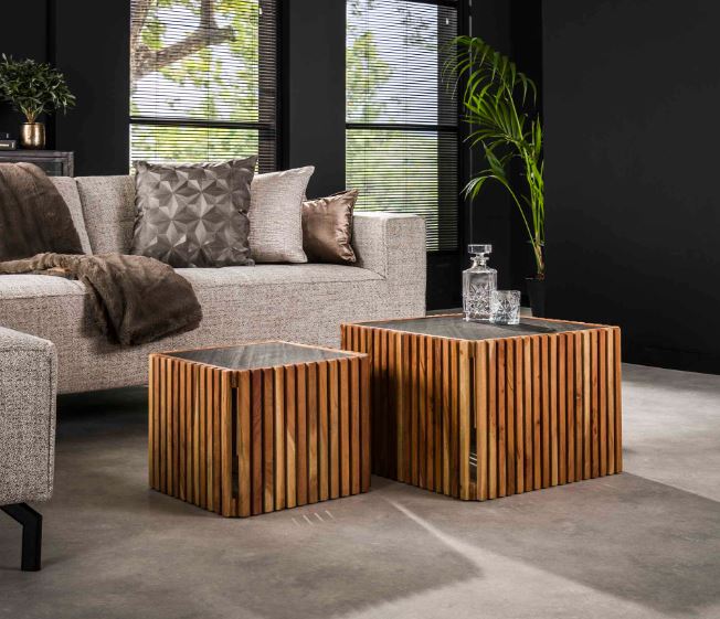 This coffee table set of 2 'slate' is finished in slate with an acacia wood frame. The slate is applied with a thin layer, giving it its beautiful look, but also keeping a comfortable weight. A timeless set suitable for any interior!