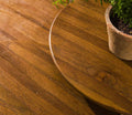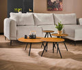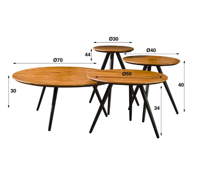This coffee table set of 4 is made of teak. The table top is inlaid with long strips. The tables all feature a black powder-coated frame consisting of 3 legs.