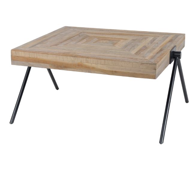 This coffee table comes from the Teca series. The table is square and made of weathered teak in strips, in a beautiful pattern. The steel frame continues on the side, giving it a tougher look.