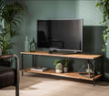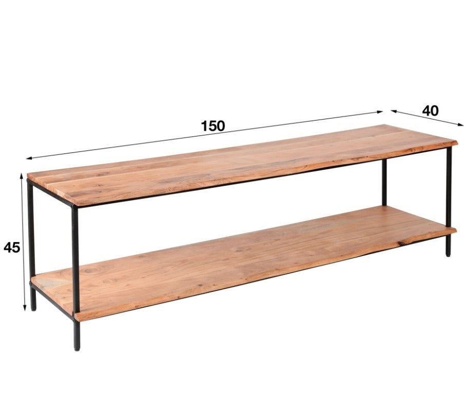 This contemporary TV cabinet is made of 11 mm thick acacia wood per shelf. The TV cabinet has a metal frame. This TV cabinet is easy to combine with the matching wall cabinet (2361).
